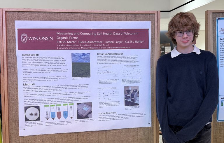 Patrick Marty spent the summer between his junior and senior years of high school doing an internship in our lab. He helped with a lot of lab work as part of the organic grains soil health project, and learned a lot of new techniques and how a research lab operates. The end of the internship program was a poster session with his fellow high school scholars. Patrick’s poster was a hit, and we can’t wait to see what he does in the future!