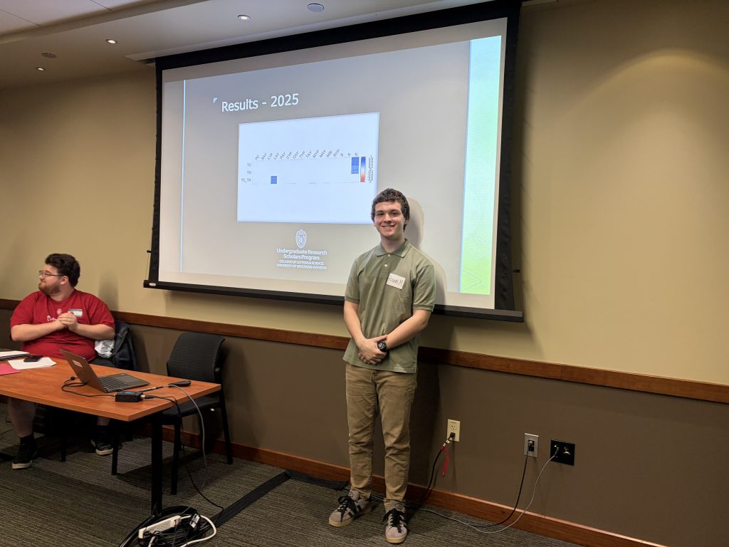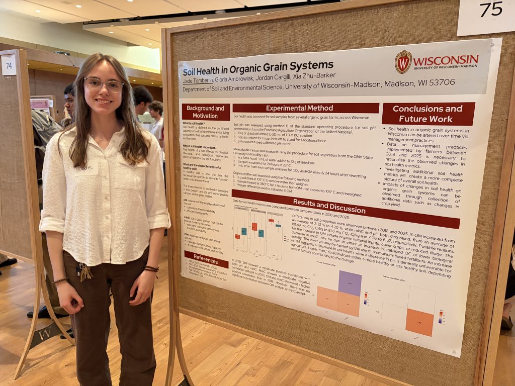 On Friday, undergraduate interns Jade Tomberlin and Rowan McCann presented the results of the organic grain soil health projects that they have been working on this year at the UW-Madison Undergraduate Symposium at Union South. Rowan’s talk and Jade’s poster both inspired interesting discussions, and they did a great job presenting their findings.
