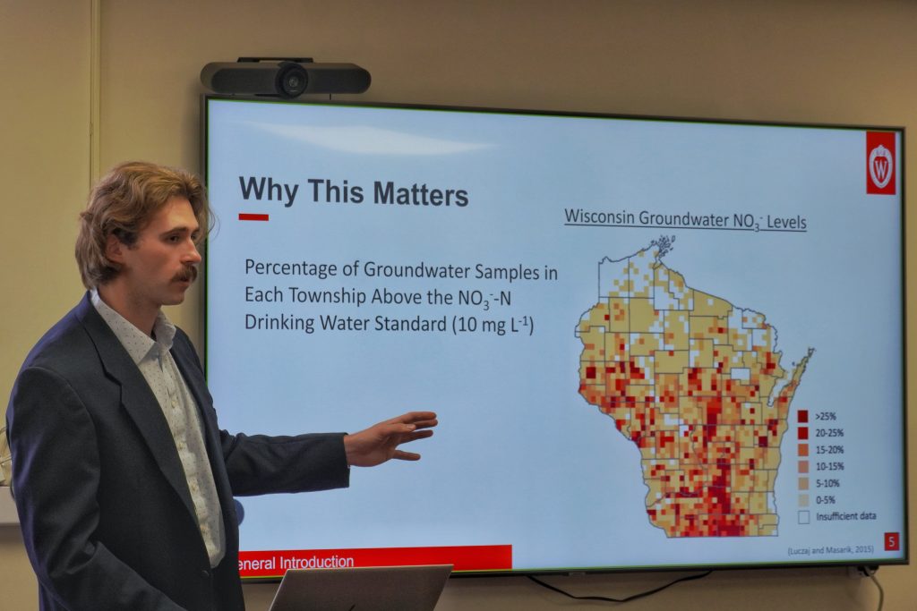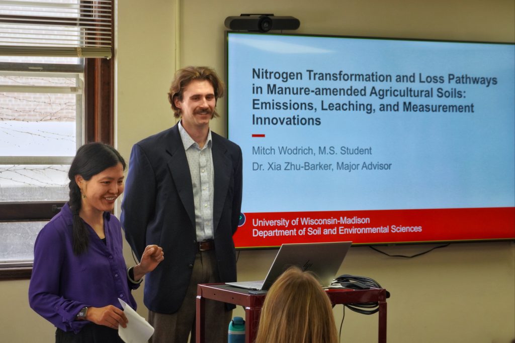 On April 23, lab member Mitch Wodrich successfully defended his MS thesis. Mitch’s thesis is titled Nitrogen Transformation and Loss Pathways in Manure-amended Agricultural Soils: Emissions, Leaching, and Measurement Innovations. His talk was given to a crowded room full of family, friends, and colleagues. Congratulations, Mitch! Hopefully he takes a little time to enjoy the accomplishment, but he’s already hard at work on his PhD project.